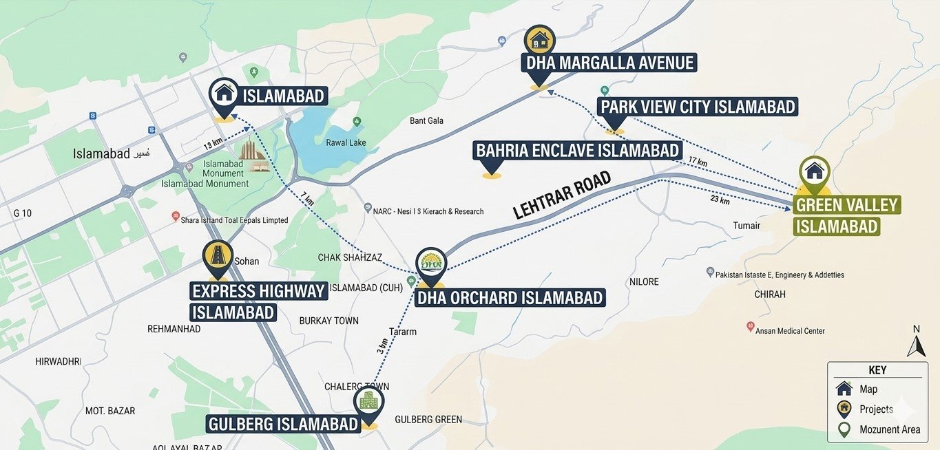 Green Valley Islamabad is ideally located on Main Tourism Highway connecting New Murree with Islamabad through Chirah Chowk, Lehtrar Road. The project is in Tamair, Karore Road.